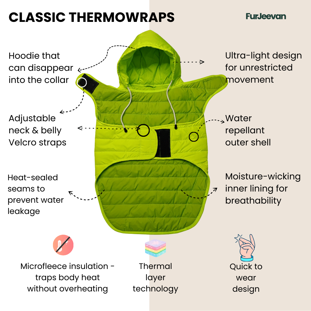 High-performance all-weather raincoat designed to keep pets warm, dry, and comfortable during rain or winter walks. Combines thermal insulation with water-repellent protection.